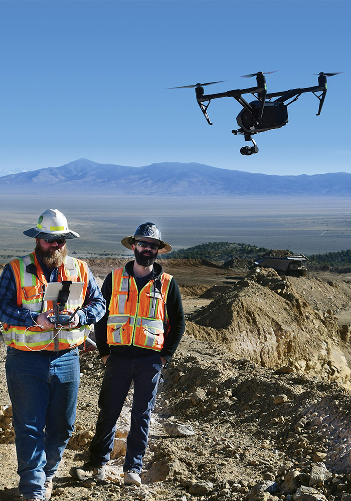 Surveyors Mark Koppe (left) and Zane Endy (right) from Bald Mountain use drone technology in the field