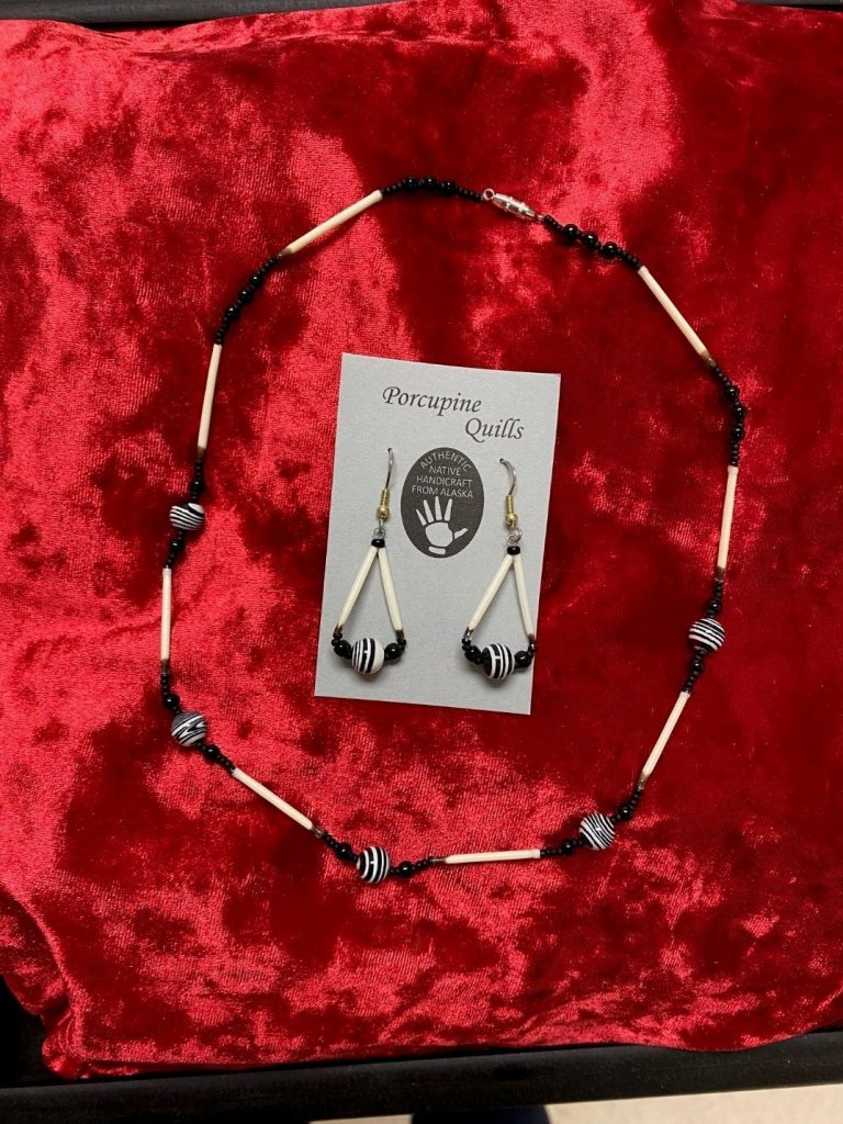 A porcupine quill necklace that was purchased by Kinross Alaska from a local Alaska Native designer