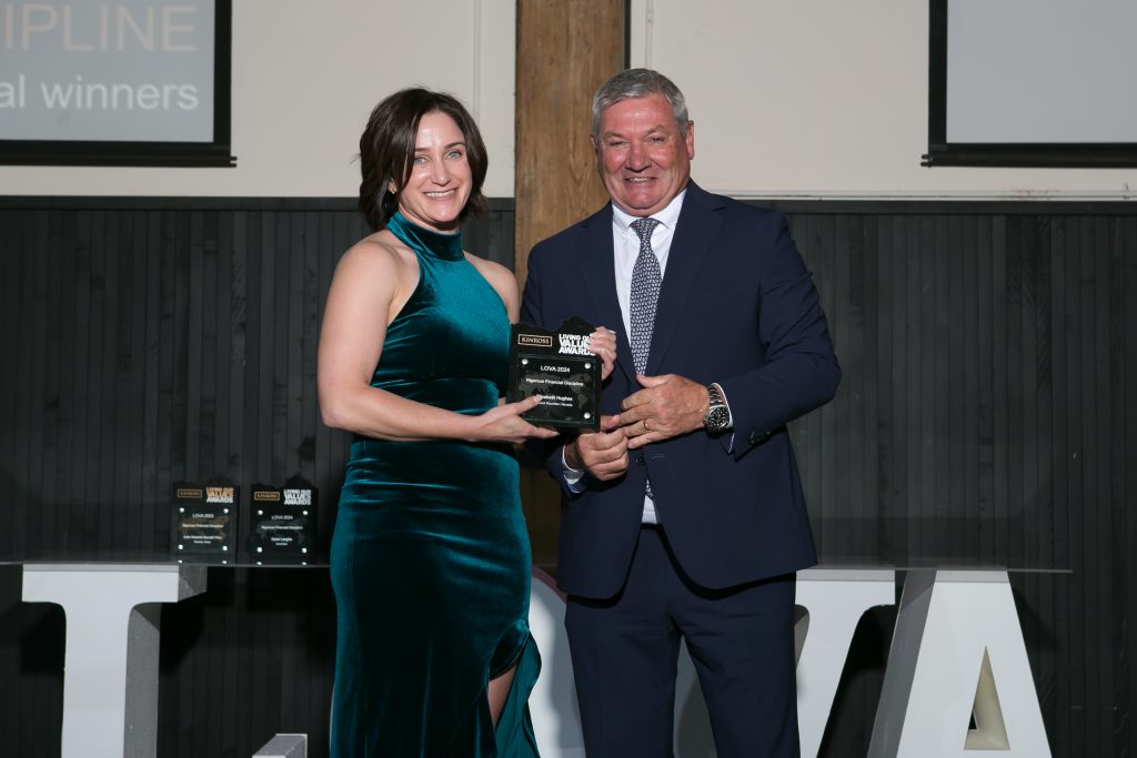Liz accepts her award from Paul Rollinson, CEO, at the 2024 LOVA gala