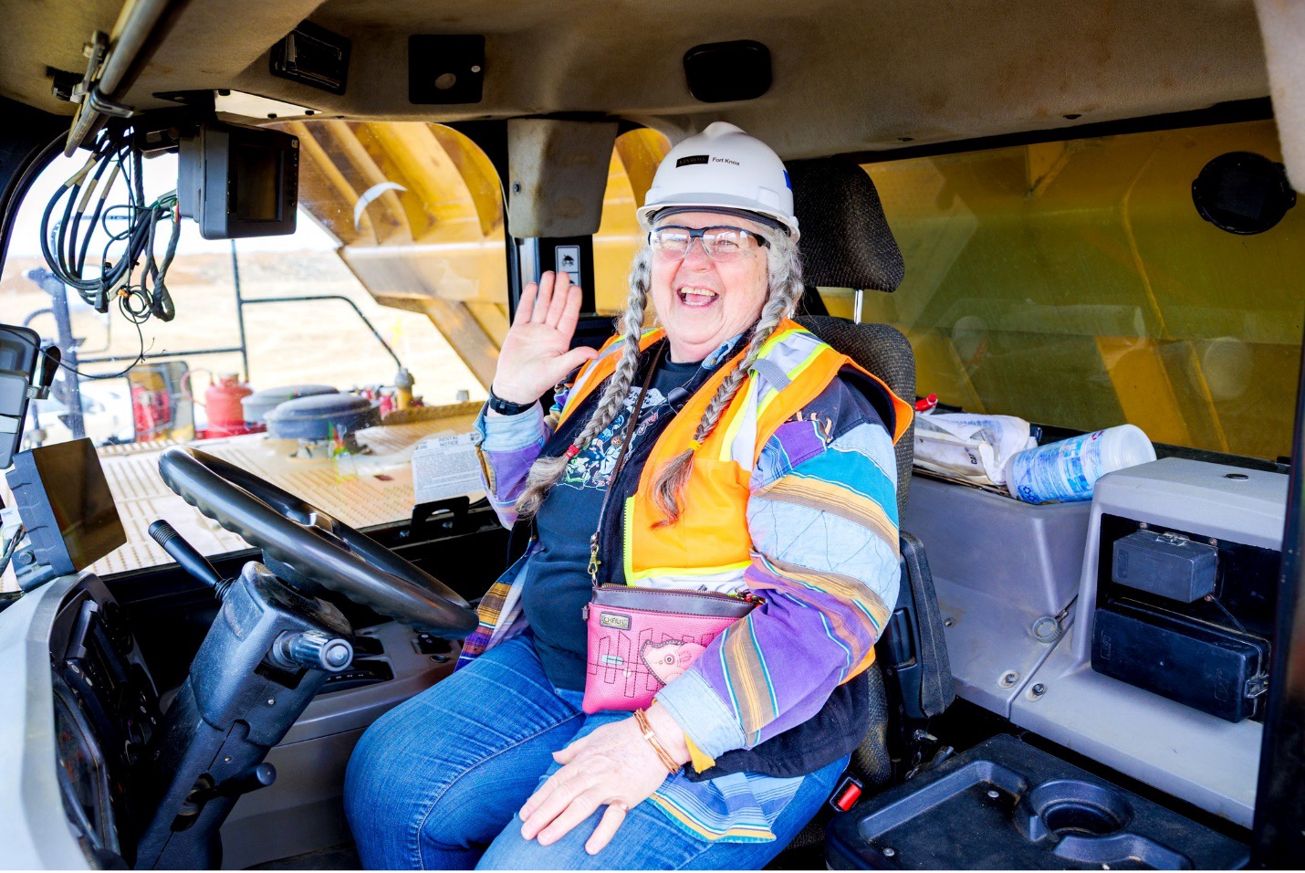 An attendee of Manh Choh’s community tour gets a ‘view from the top’ inside the cab of a CAT 777 Haul Truck