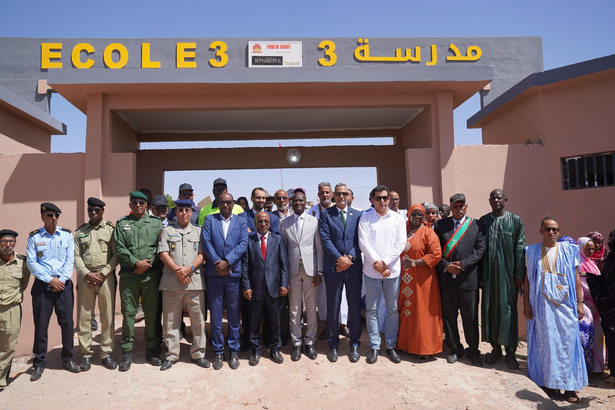 Kinross’ External Relations and Community Relations team members with local government officials and community members outside of the new school built in the Akjoujt community