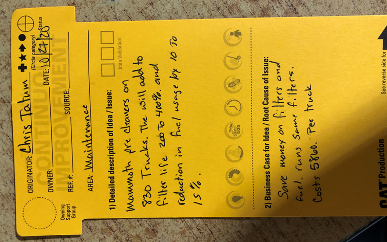 An example of a CI card employees can submit – this was specifically for the mammoth precleaners
